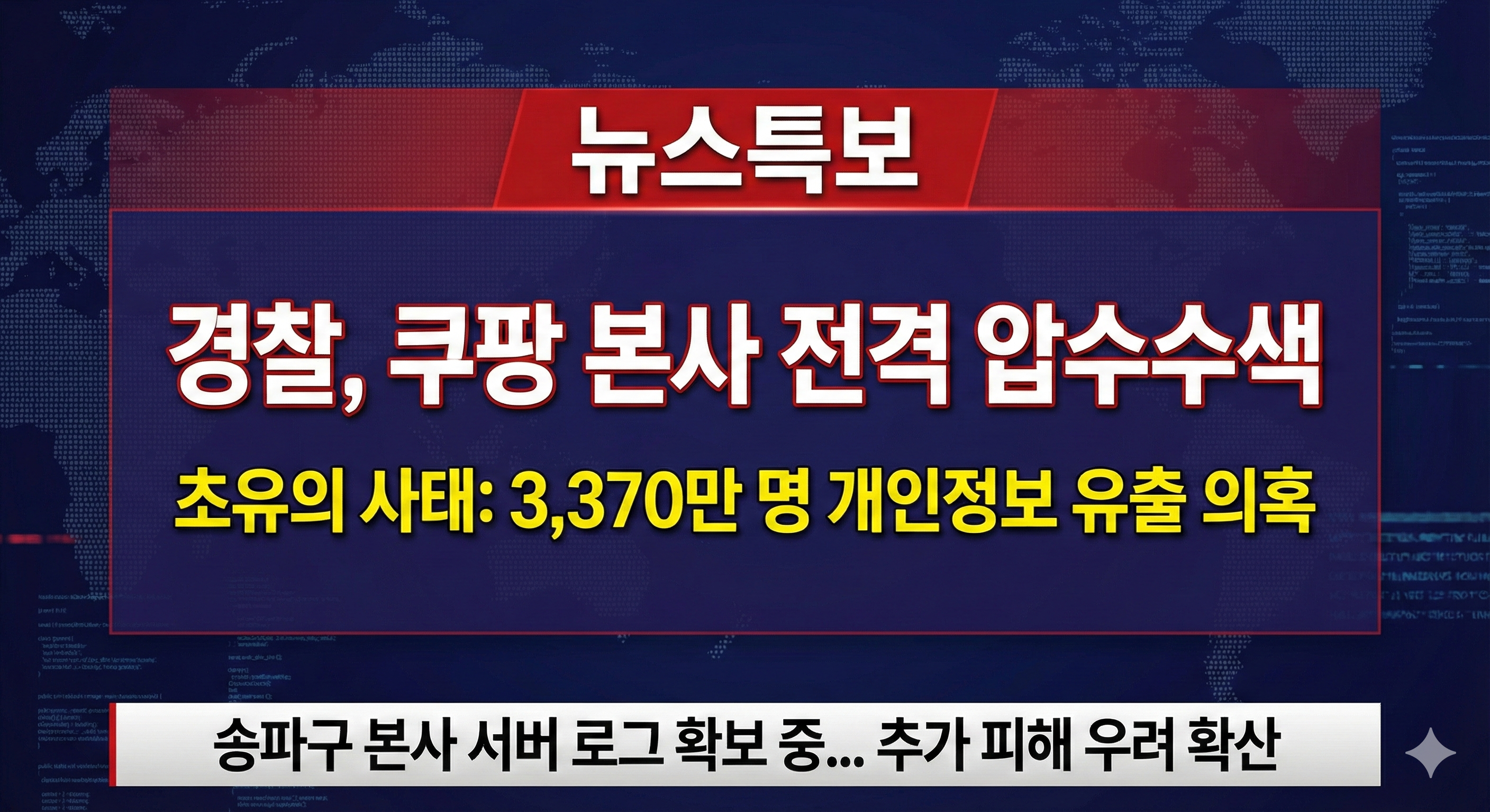 Security Alert • 2025 Special Report쿠팡 3,370만 명 개인정보 노출 의혹:접근 정황 포착 및 긴급 대응 가이드대한민국 인구의 65%에 달하는 데이터 접근 흔적 발견. 경찰의 본사 압수수색으로 드러난 '유출 위기'의 실체와 법적 대응 현황을 분석합니다.발행일: 2025년 12월 10일 | 분류: 보안/IT 정책🚨 Executive Summary: 핵심 요약사건 현황: 경찰, 쿠팡 서버에서 3,370만 명 규모의 데이터에 '비정상적 접근'이 발생한 로그 확보.핵심 쟁점: 해커의 '접근(Access)'은 확인되었으나, 데이터의 외부 반출(Exfiltration) 여부는 디지털 포렌식 진행 중.노출 의심 항목: ID, 이름, 휴대전화번호, 배송지 주소 등 (결제 정보 직접 접근..